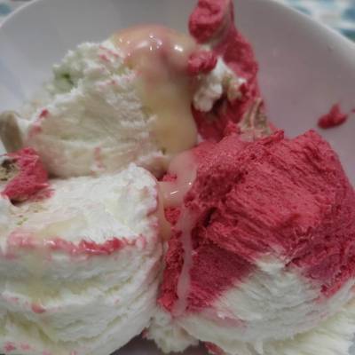Creamy raspberry ice cream mixed with a raspberry swirl and miniature. Perfect service clean store and the.